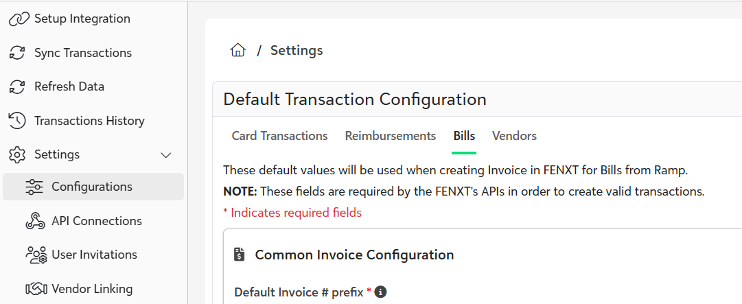 The Default Transaction Configuration section defines how Bills from Ramp will be created in FENXT. These default values ensure all transactions meet the required fields in FENXT's APIs and help streamline transaction processing.