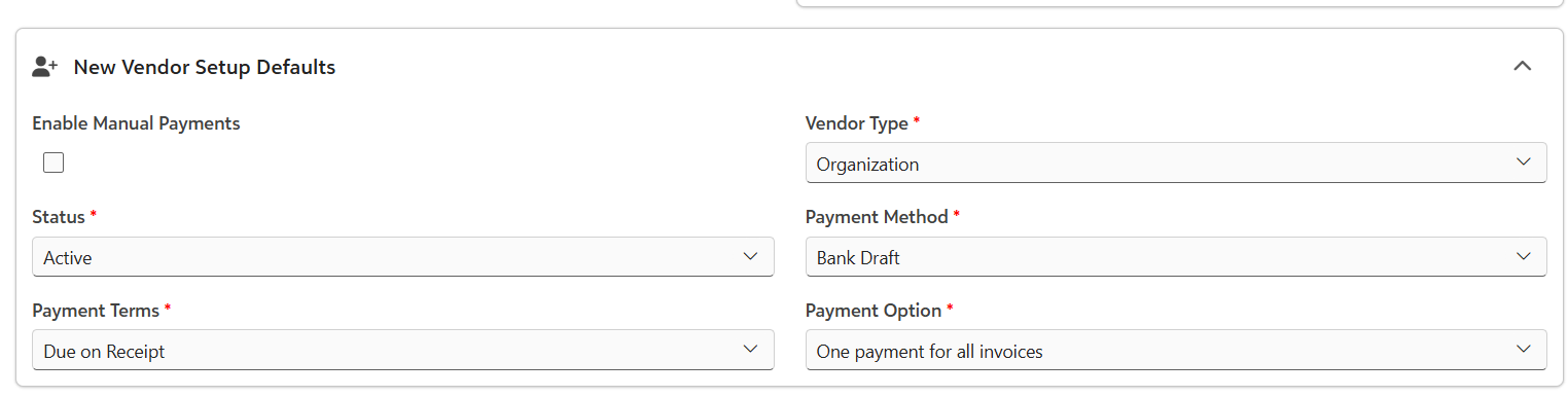 - Enable Manual Payments - Whether or not to accept manual payments for this new vendor.