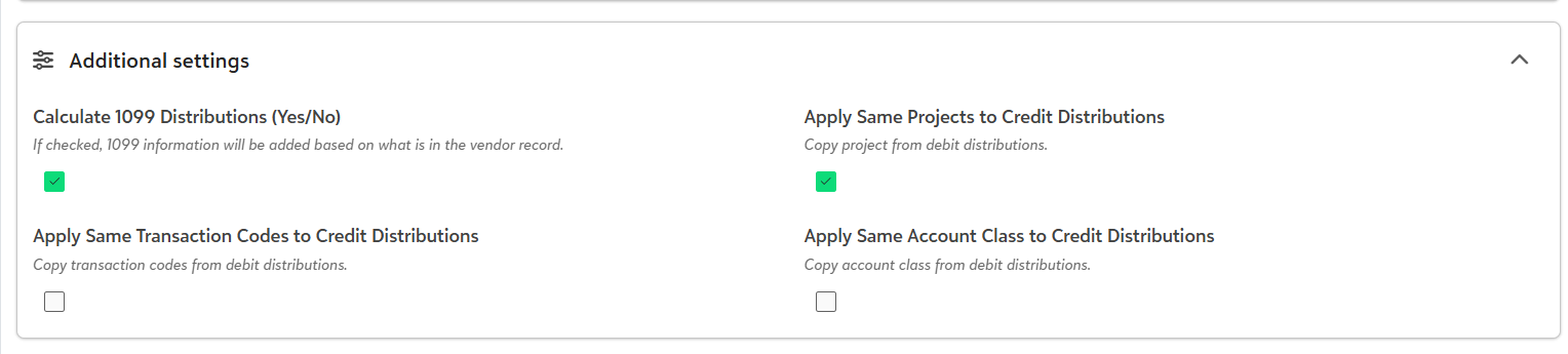 - Calculate 1099 Distributions - If your organization utilizes 1099 Distributions in Ramp, use this setting to add the 1099 information based on what is in the vendor record.